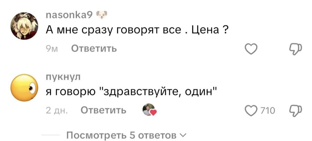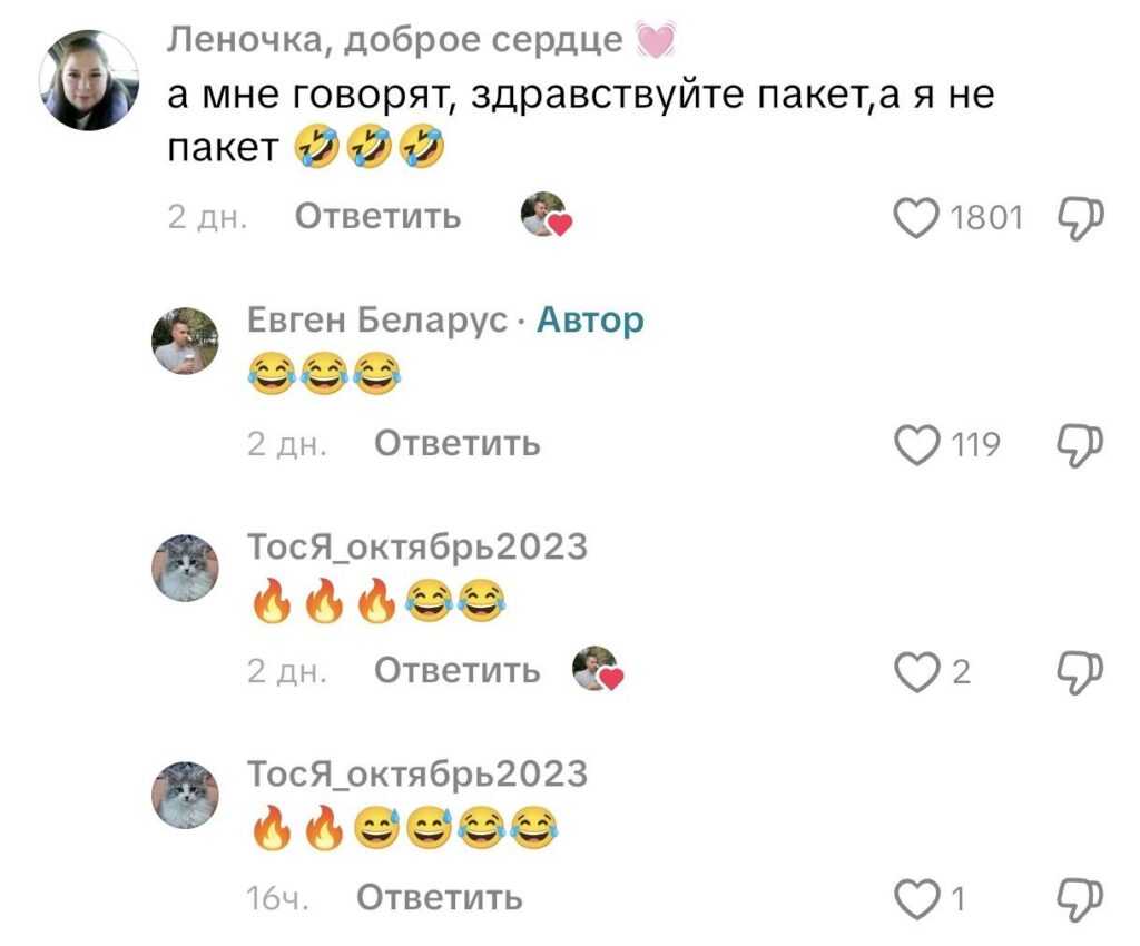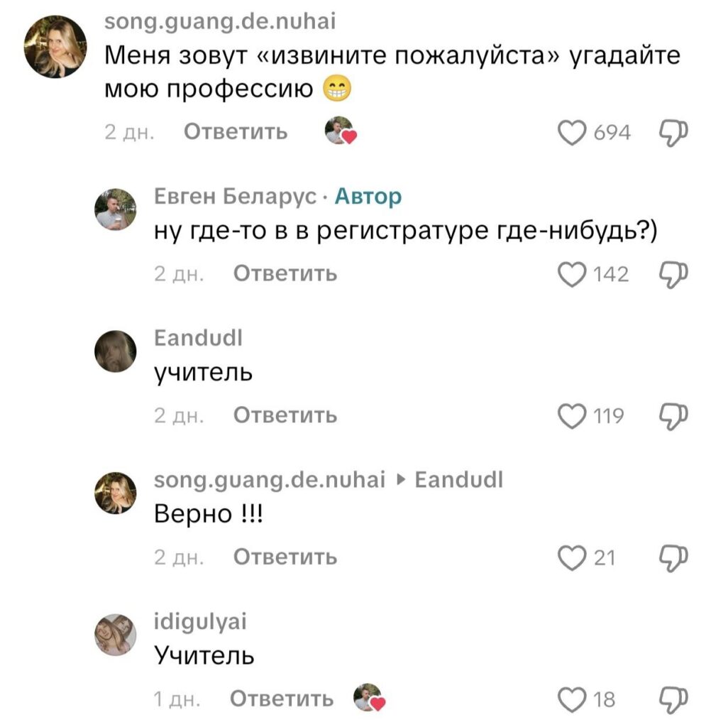 В комментариях люди стали писать, как их называют на работе, другие же — отгадывали. Вот, например: «Меня зовут «извините, пожалуйста», угадайте мою профессию», — написала одна из пользовательниц. Белорусы предположили: либо в регистратуре, либо учителем. Еще одна дама и вовсе рассказала, что ее называют «на все». Выяснилось, что особа работает в киоск-остановке, где продает билетики. Кого-то и вовсе зовут: «здравствуйте, пакет».