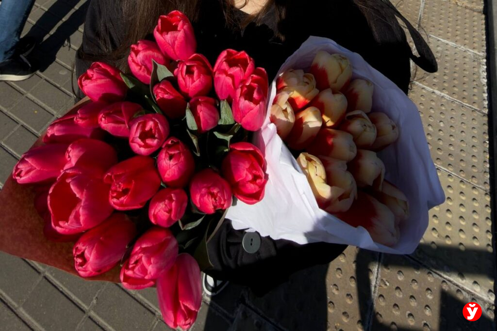 Первое, что бросается в глаза на входе — сезонные тюльпаны. На рынке было 2 точки: крупные, яркие бутоны продают всего по 2 рубля за штуку. Устоять сложно — мы в итоге уехали с двумя букетами, потратив на них около 80 рублей.