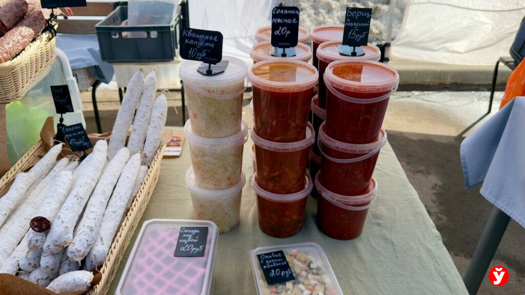 Тем, кто приезжает на рынок не только за продуктами, но и за готовым обедом, есть из чего выбрать. На прилавках можно найти классические салаты — оливье и селёдку под шубой по 20 рублей. Рядом стоят банки с домашними заготовками: большая банка квашеной капусты — 10 рублей. Есть и готовые супы. Например, мясная солянка продаётся по 20 рублей за банку, а борщ — по 15.