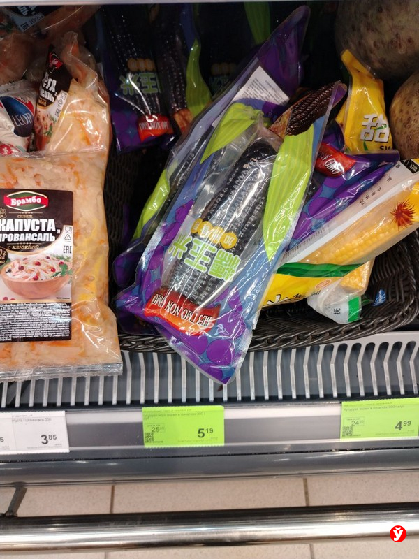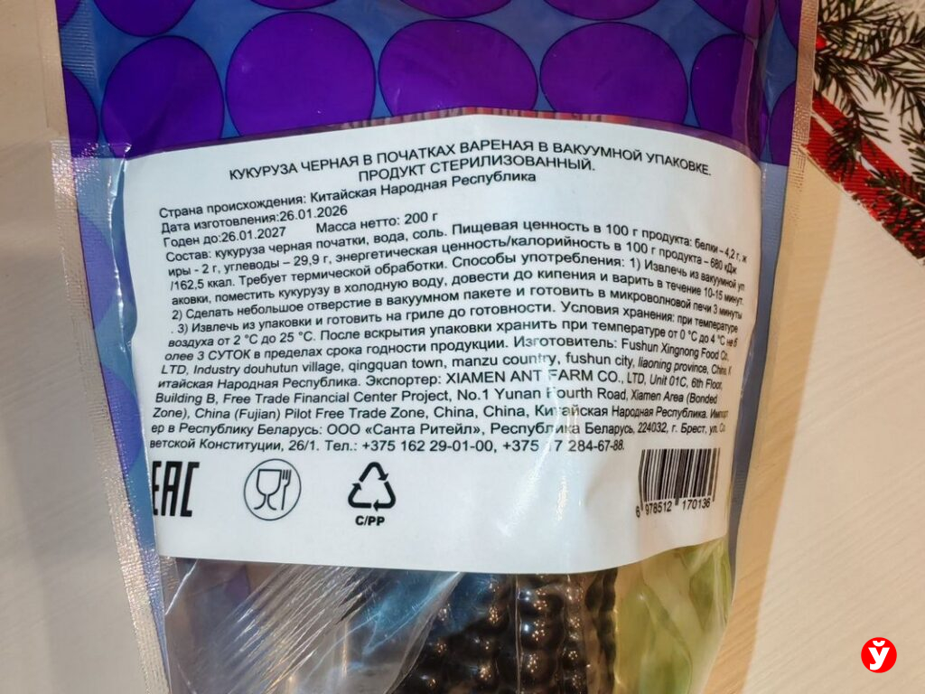 В магазинах «Санта» черной «царицы полей» действительно много. Зашла в первый попавшийся торговый объект — и на тебе, вся полка усыпана нетипичными початками в вакууме. Если верить ценнику, одна штука стоит 5,19 рубля — но на кассе мне пробили 4,99. Ладно, спишем это на человеческий фактор или техническую ошибку.
