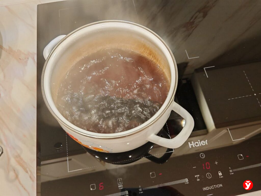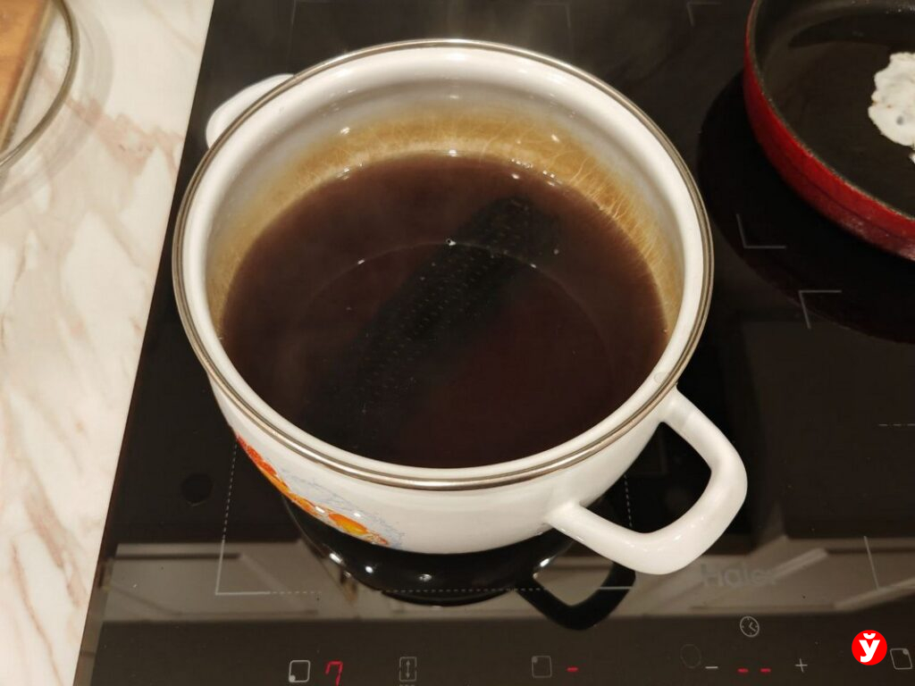 Делаю всё по инструкции: в холодную воду опускаю початок, довожу до кипения и засекаю 10 минут. Пока вода только нагревалась, она оставалась почти прозрачной. Но как только взялась бурлить — начала темнеть. Через десять минут в кастрюле плескались настоящие чернила: кукурузы уже не было видно! Зато кухня, наконец, наполнилась тем самым кукурузным духом: сладковатым, чуть молочным.