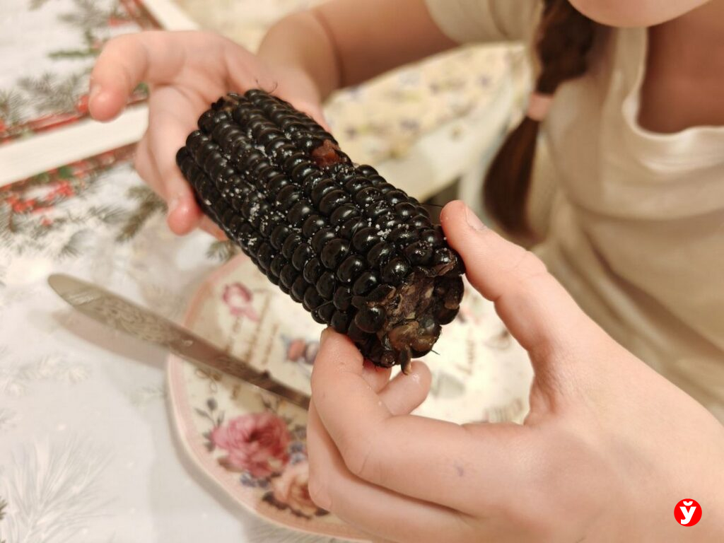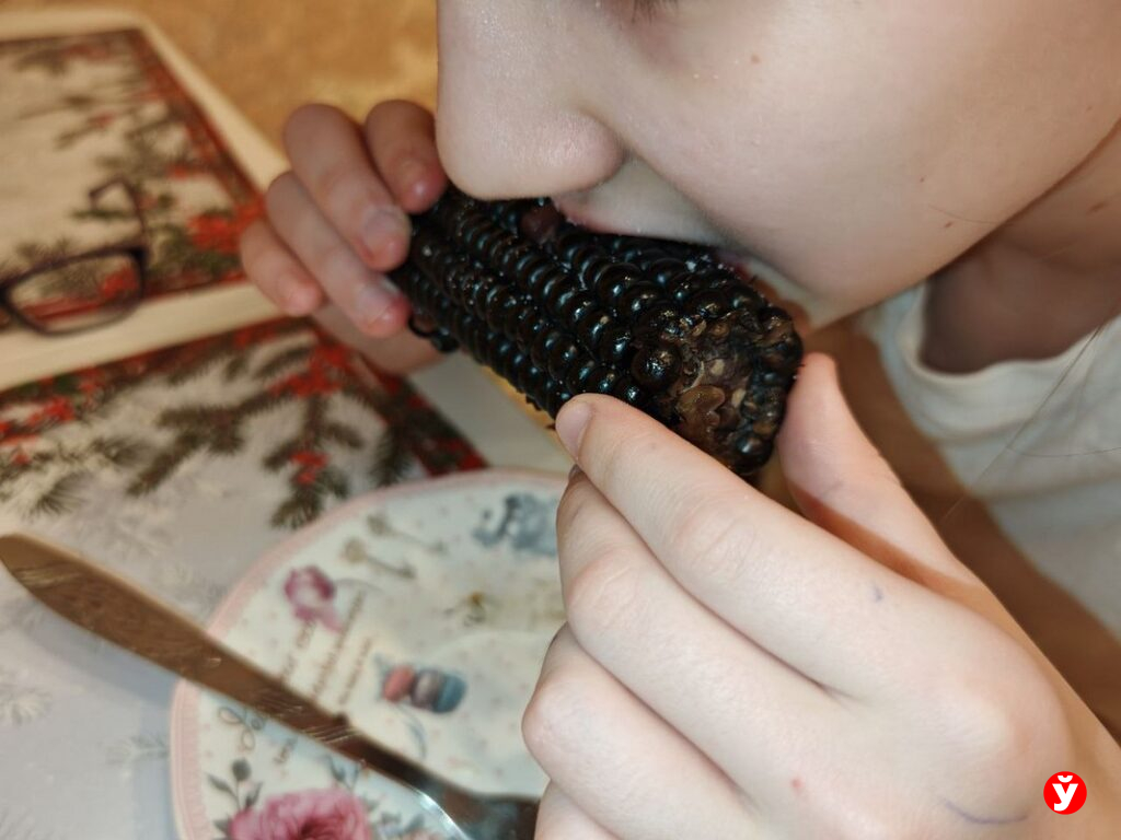 С дочкой по-честному разделили чёрную кукурузу — но первой попробовать она предложила мне. Мол, ты, мама, взрослая, с тобой ничего не случится.