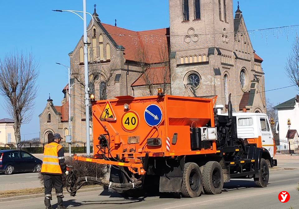 Также улицу Победы в Логойске от песка и остатков соли после зимы чистит спецтехника «Бродвей». За день работники комхоза произведут около 150 м кв. ямочного ремонта.