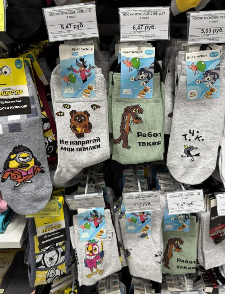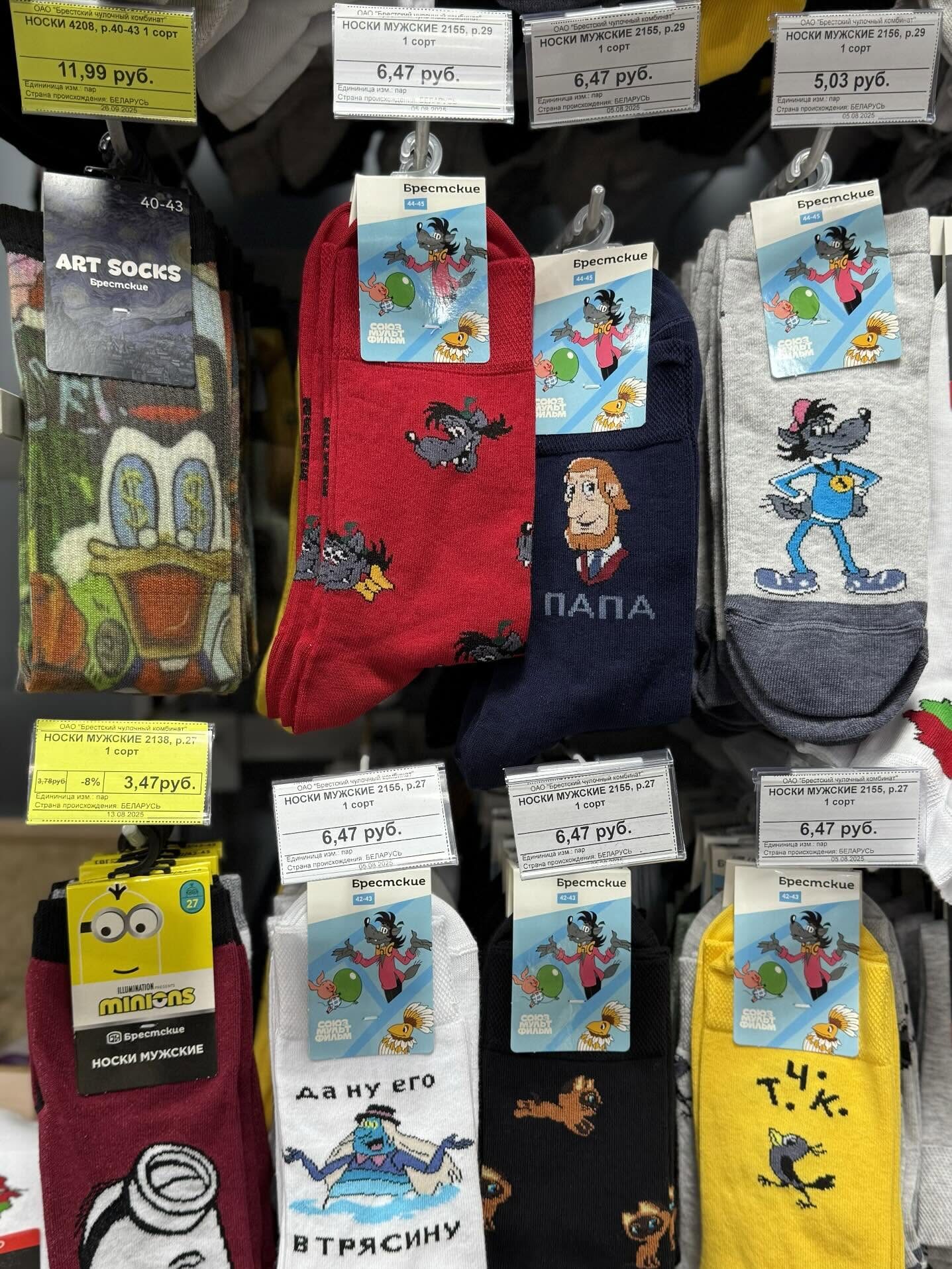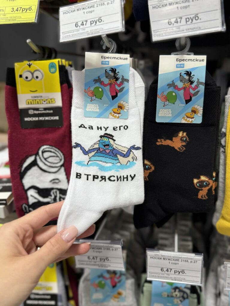 Отойдем от пластикового ажиотажа. Пока Волк, Заяц и Ёжик в тумане кочуют из рук в руки по заоблачным ценам, на сцену выходят носки от Брестского чулочного комбината. Они стали популярны в соцсети Threads.