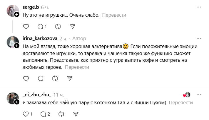 «Я заказала себе чайную пару с Котёнком Гав и с Винни Пухом», — делятся в комментариях Threads довольные поклонники.