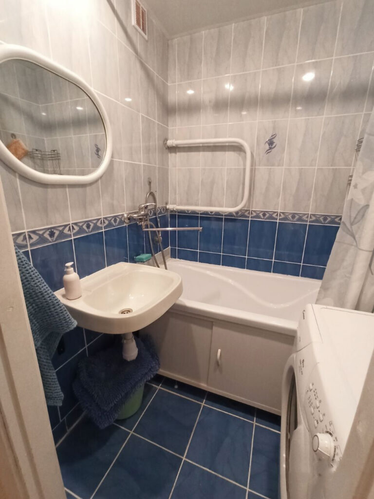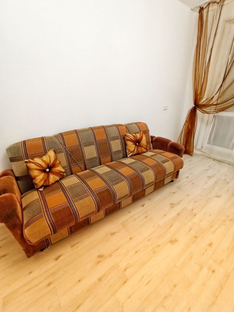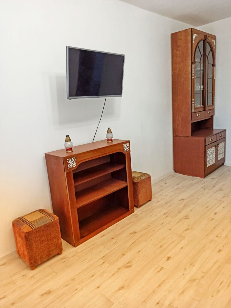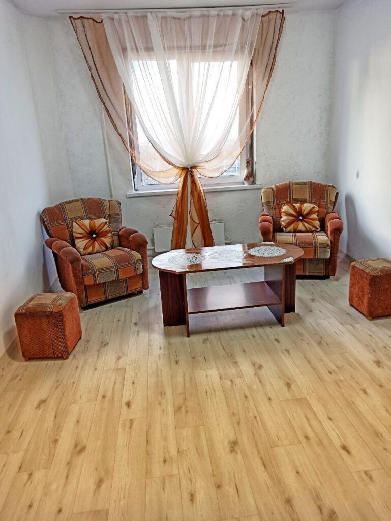 Жилье трехкомнатное с минимальным набором мебели — диван, кресла, кровать и шкафы для одежды и посуды. Имеется телевизор и интернет. В кухне есть все необходимое для приготовления пищи: газовая плита, холодильник, раковина, рабочее пространство и даже кулер с питьевой водой.