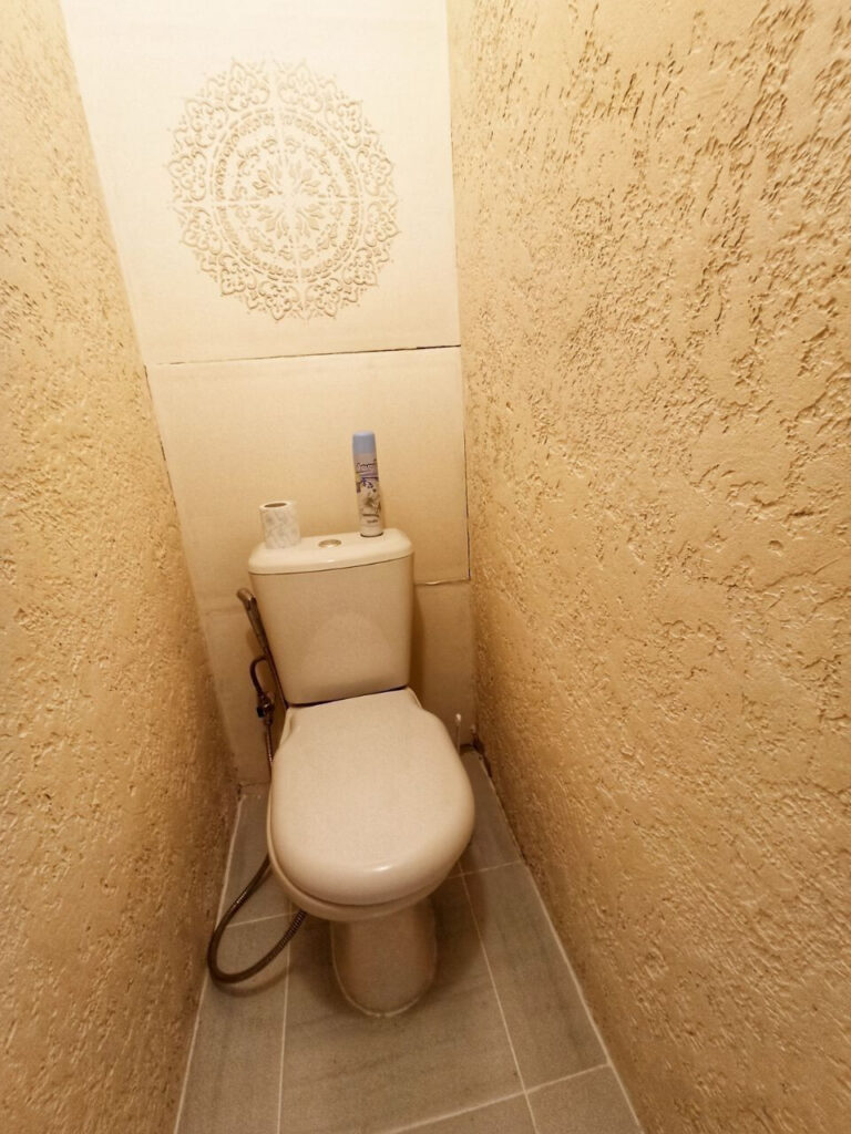 Единственное, что выбивается из общего стиля — ванная. Помещение выполнено в бело-голубых тонах без стилизации, а вот туалет оформлен в стиле пустыни.