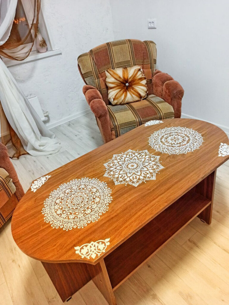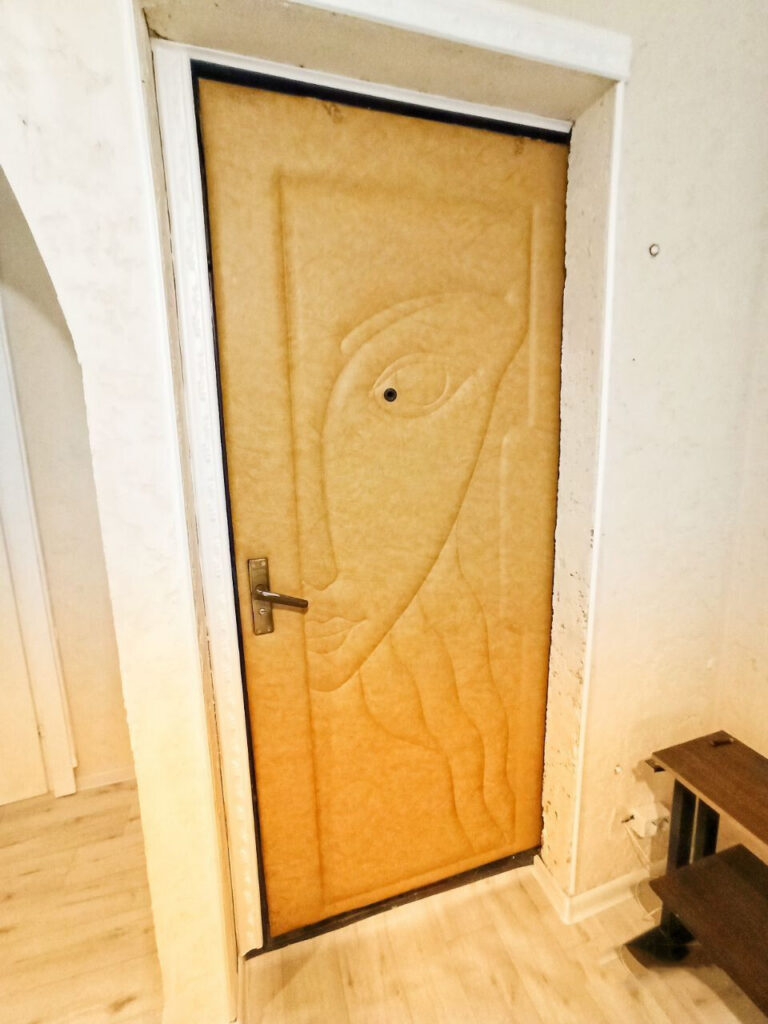 Цветокор квартиры белый и песочно-желтый. Мебель преимущественно деревянная с повторяющимся восточным рисунком, что создает атмосферу единого ансамбля. Стилизована даже входная дверь — на внутренней части изображена дама в анфас на две четверти. Забавно, что ее «глаз» совпадает с дверным глазком.