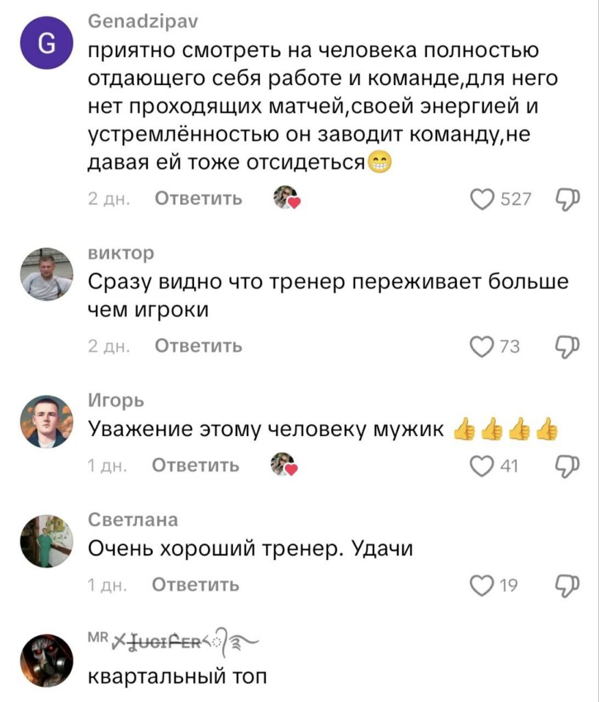 Люди с восторгом принимают любое действие мужчины. Все дело в том, что при нем «Динамо» реально заиграло. «Приятно смотреть на человека полностью отдающего себя работе и команде, для него нет проходящих матчей, своей энергией и устремлённостью он заводит команду, не давая ей тоже отсидеться», — прокомментировал один из пользователей. «Дмитрий Вячеславович все хорошо, не нервничаете, все мы знаем что Динамо Минск лучшие», — написал второй. «Сразу видно, что тренер переживает больше чем игроки», — уверен третий. «Только уважение этому тренеру, мужик с большой буквы», — убежден четвертый.