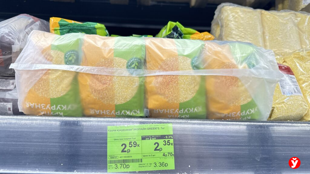 - Кукурузная крупа: 2.59 руб., при покупке двух одна стоит 2.35 руб.