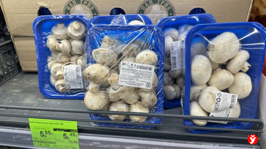 - Шампиньоны — 5.89 руб. за упаковку, но 5.49 руб. за одну упаковку, покупая две.