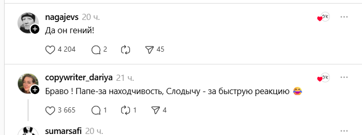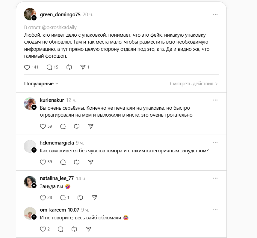 И все же большинство пользователей похвалили маркетологов и фабрику за молниеносную и креативную реакцию на вирусный контент.