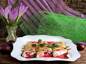 Французские крепы отличаются от русских блинов не только названием, но и текстурой. Добавление крахмала и большого количества яиц делает их эластичными, почти кружевными. А начинка здесь — отдельный разговор. Сливы в сахарной карамели идеально подходят общему вкусу блюда.