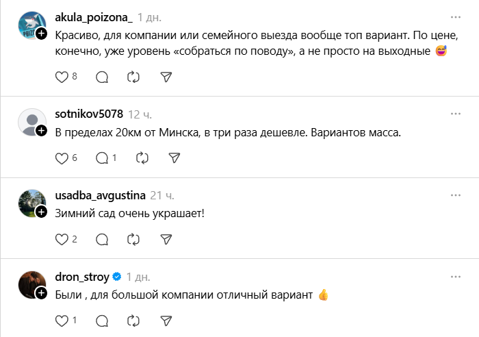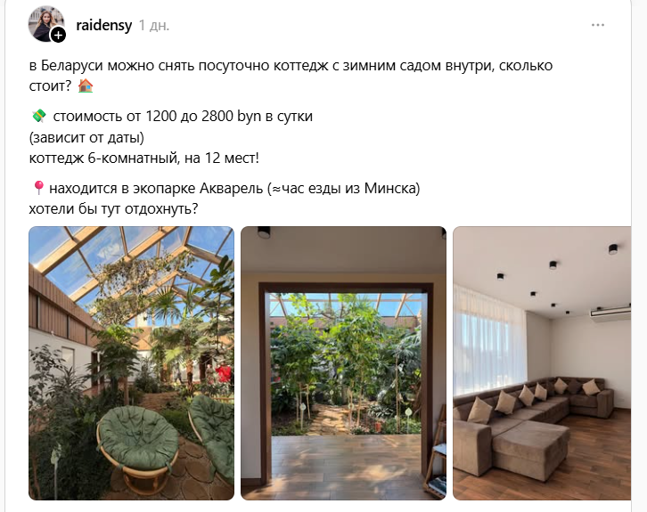В Минской области, недалеко от Марьиной Горки, в экопарке «Акварель» можно арендовать коттедж с зимним садом. На это обратила внимание пользовательница Threads.