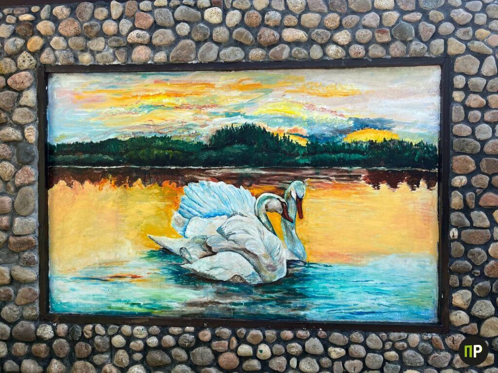 В 2021 году на заборе внутри двора появился «Рассвет с лебедями». А через два года — «Драка петухов». Так начинается его личная галерея под открытым небом.