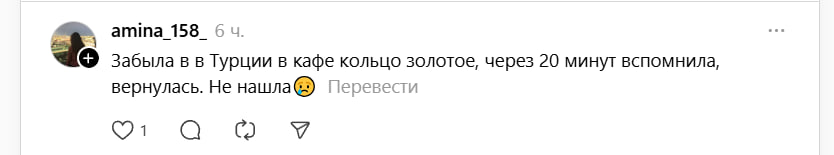 Другой, увы, более типичный: «Забыла в Турции в кафе кольцо золотое, через 20 минут вспомнила, вернулась. Не нашла».