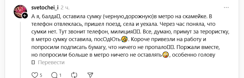 Некоторые истории вызвали улыбку. Одна девушка рассказала, как забыла в метро дорожную сумку, а через час ей позвонила милиция. «Все, думаю, примут за терористку, в метро сумку оставила, посОдЮть. Короче привезли на работу и попросили подписать бумагу, что ничего не пропало… поржали вместе, но попросили больше в метро ничего не оставлять, особенно голову».