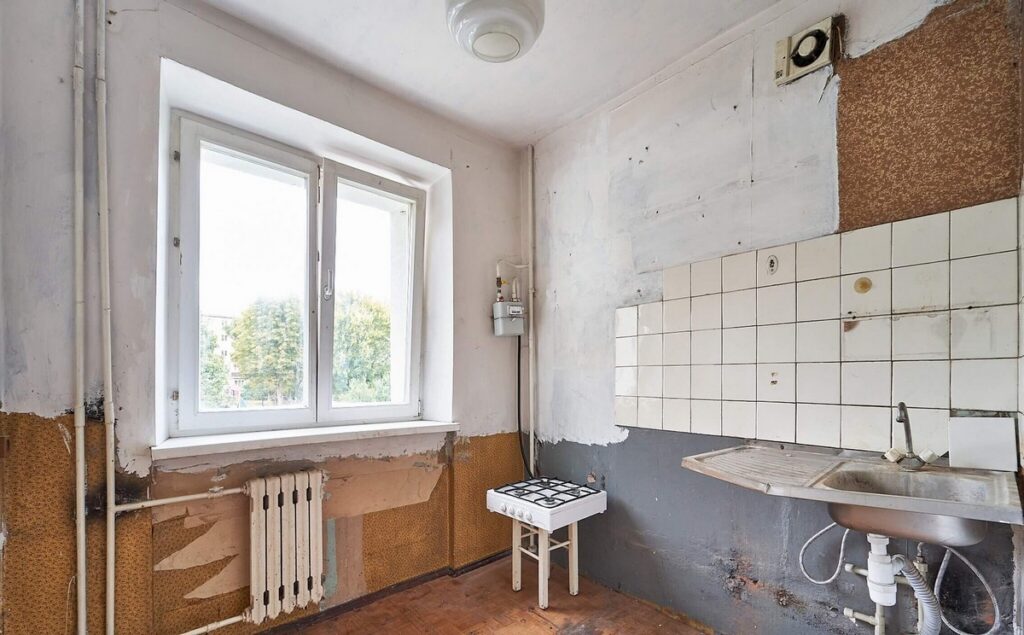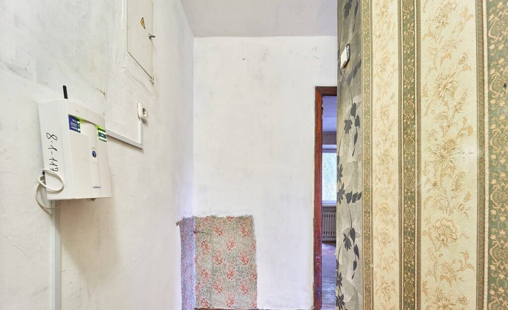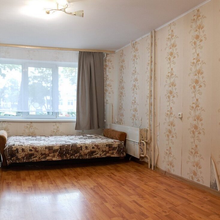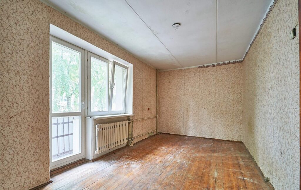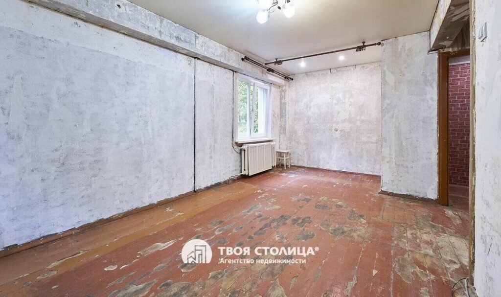 Квартира требует ремонта, и владельцы частично подготовили ее к этому, убрав мебель из комнаты. В помещении деревянные полы, а в комнате расположены два окна, что обеспечивает хорошее естественное освещение. Для хранения вещей предусмотрена ниша в коридоре. Санузел совмещенный. Балкона в квартире нет.