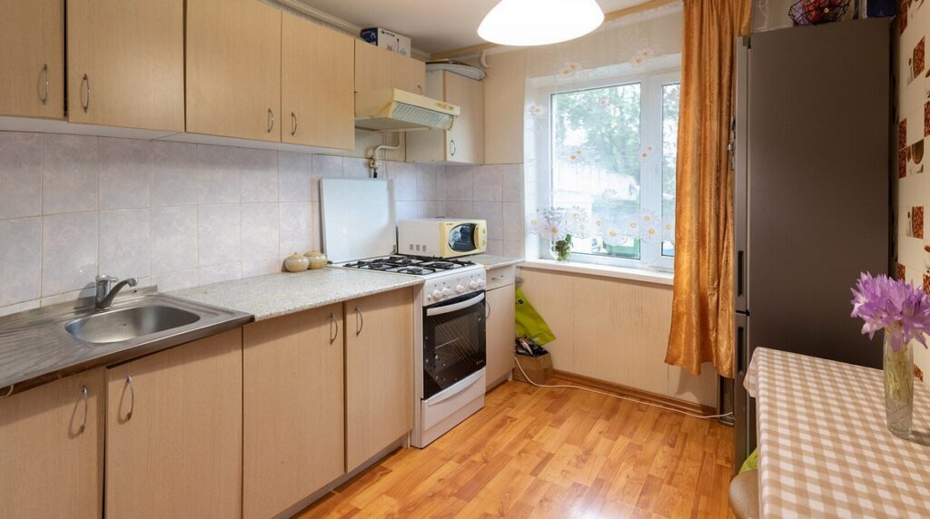 Этот пятиэтажный дом, расположенный по адресу Берута, 24/4, был построен в 1964 году. Квартира, выставленная на продажу, находится на третьем этаже и имеет площадь 30,7 квадратных метра. Кухня занимает 5,8 квадратных метра.