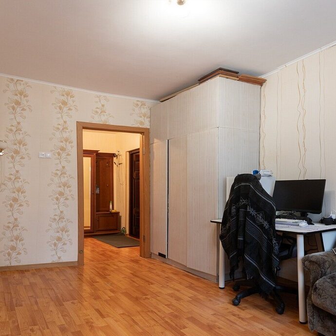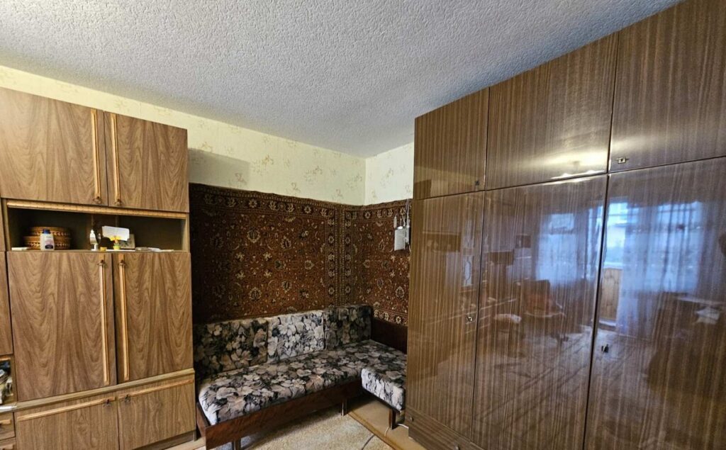 Жилище требует ремонта и обновления. На полу в комнате уложено деревянное покрытие. Из комнаты есть выход на застекленный балкон, где можно приятно проводить время. В коридоре расположены встроенные шкафы, что позволяет эффективно использовать пространство для хранения вещей. Санузел в квартире раздельный.