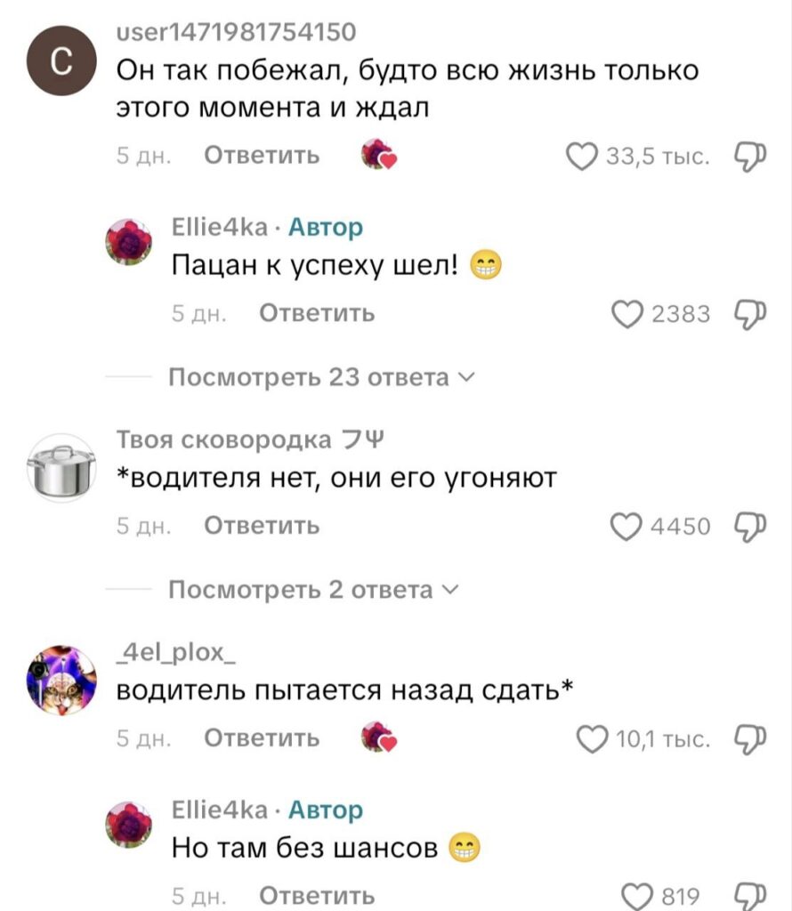 «Ох, мечта. я прям мечтаю какую-нибудь машину вытолкать, серьёзно. я в детстве грузовик отцу помогала выталкивать (он в нем сидел, я толкала)», — поделилась девушка. Не зря Президент объявил 2026-й годом белорусской женщины. Вот такие они наши прекрасные дамы. «Водителя нет, они его угоняют», — пошутил еще один пользователь. Кстати, его юмор оценили 4450 человек. «они угоняли автобус, а прибежал водитель», — остроумно высказался еще один пользователь.\