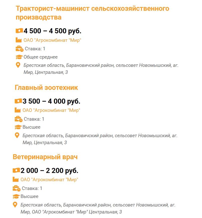 - ОАО «Агрокомбинат «Скидельский» предлагает главному ветеринарному врачу 2500–2600 рублей, а заместителю главного инженера — 2300–3000 рублей.