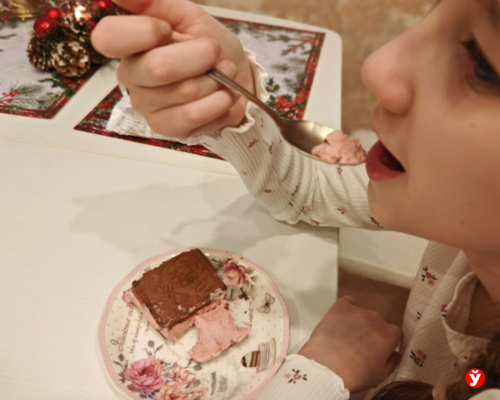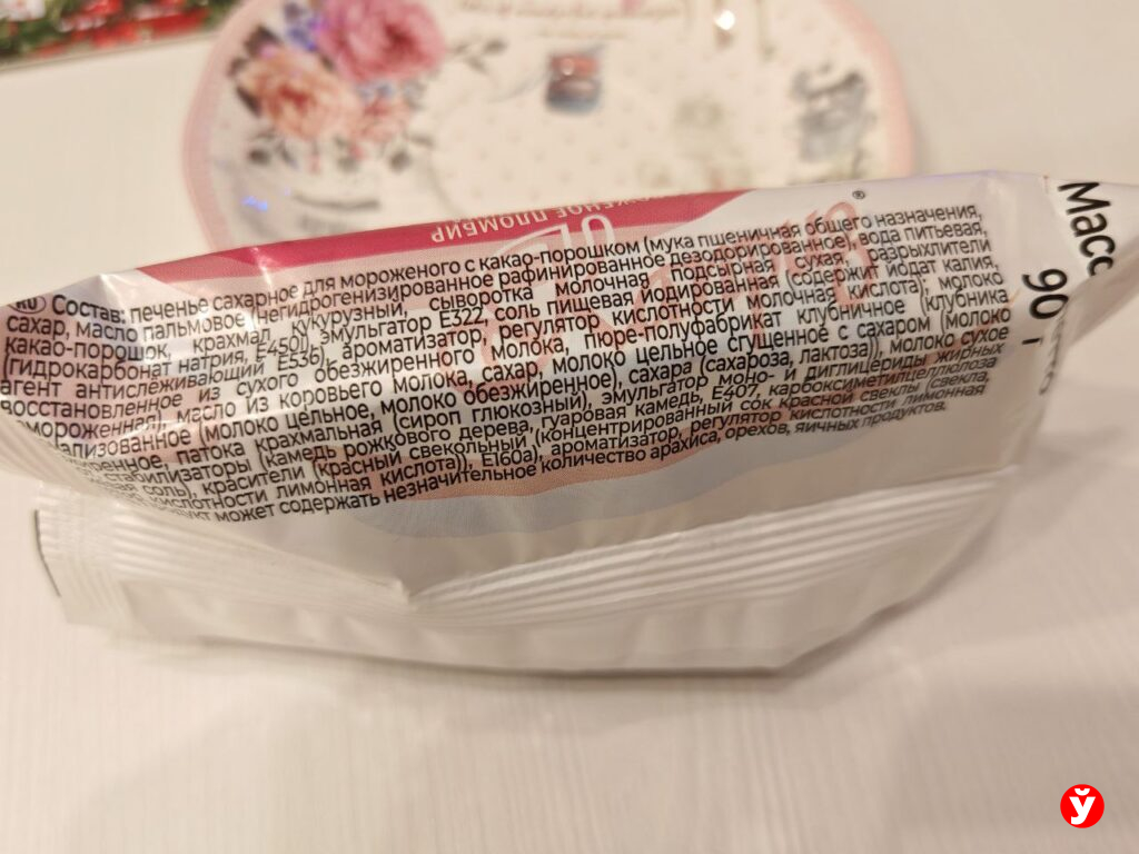 — Из хорошего — в составе есть клубника замороженная. То есть не просто ароматизатор клубничный, а именно ягоды. Из плохого – пальмовое масло, но оно не в самом мороженом, а в печенье. Поэтому им не увлекайся: один малюсенький кусочек, и больше не надо, — попросила школьницу.