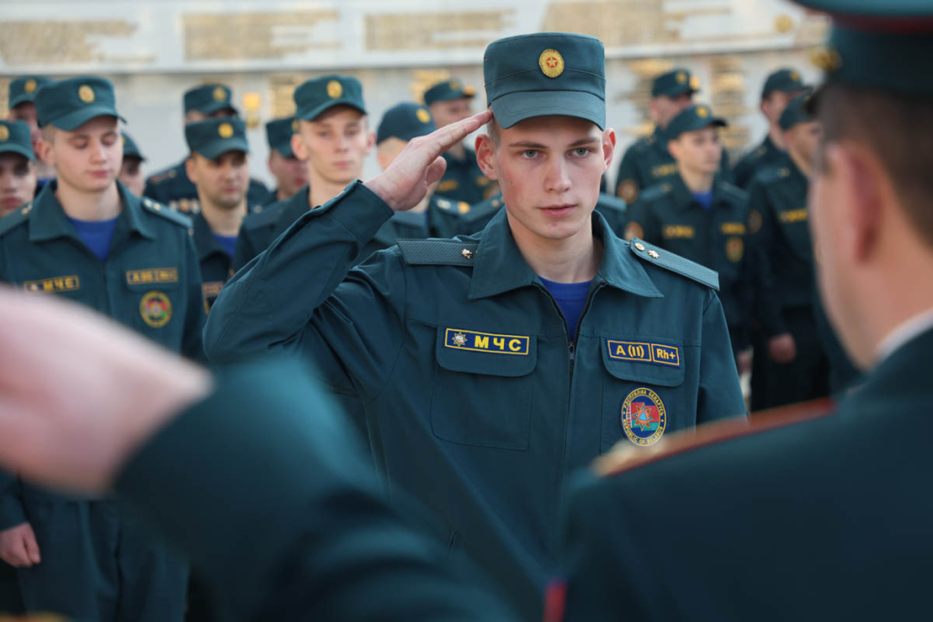 61 молодой спасатель, стоя в строю, произнёс слова присяги на верность стране и народу, поклявшись ежедневно следовать девизу Министерства по чрезвычайным ситуациям Республики Беларусь — «Профессионализм. Отвага. Честь».