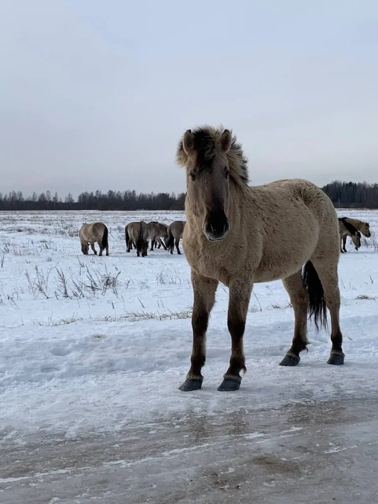 Животных заметили в районе Налибокской пущи. По словам очевидцев, лошади не только не испугались, но и охотно шли на контакт, спокойно подходили ближе и внимательно рассматривали людей. Кадры получились почти сказочными — густая зимняя природа и свободные, сильные животные на фоне снега.