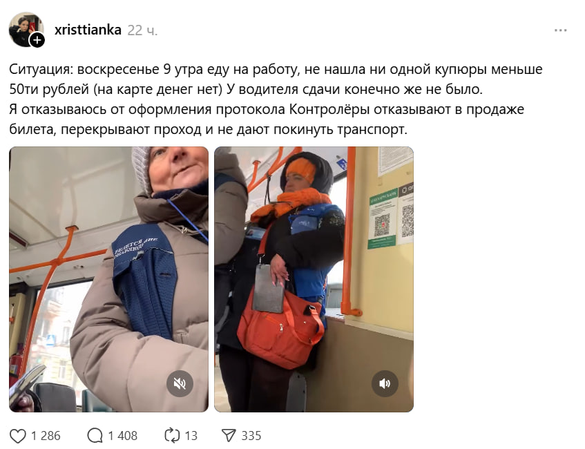 «Ситуация: воскресенье 9 утра еду на работу, не нашла ни одной купюры меньше 50 рублей (на карте денег нет). У водителя сдачи, конечно же, не было. Я отказываюсь от оформления протокола. Контролеры отказывают в продаже билета, перекрывают проход и не дают покинуть транспорт».