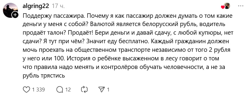 «Если у водителя общественного транспорта не оказалось талонов (или сдачи) для продажи пассажиру, это не освобождает пассажира от ответственности за безбилетный проезд. Пассажир обязан заранее приобретать билеты, поэтому при проверке контролёрами отсутствие талонов у водителя не является уважительной причиной, и штраф (0,5–1 базовой величины) будет выписан», — написал пользователь под ником iakutovicht.