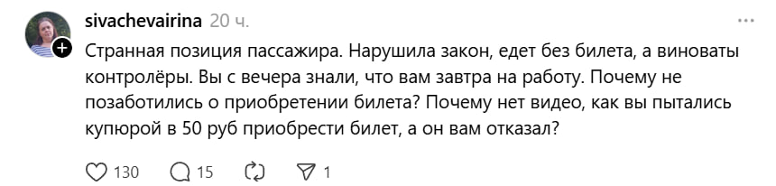 «Я, конечно, против скандалов таких — и со стороны контролёров, и со стороны пассажиров, но сейчас такое время: есть приложение «Оплати», у меня налички никогда нет. Не на каждой остановке есть киоски с талонами, для удобства у меня там всегда руб. 10 в приложении висит, хотя у меня личное авто вообще… Зачем из ничего делать себе нервы? Вы б зашли, да скачали бы это приложение, перевели с карты пару рублей и всё (попросили бы у родных на крайний)», — подчеркнула ann.mushinskaya.