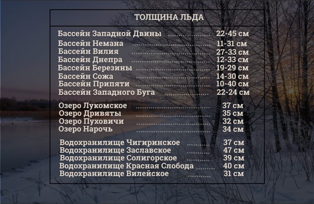 На водохранилищах Вилейское, Чигиринское, Солигорское, Заславское, Красная Слобода, а также озерах Нарочь, Дривяты, Червоное и Лукомское держится сплошной ледяной покров толщиной 31–47 см.