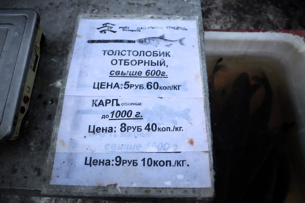 У рыбхоза «Грицево» карп весом до одного килограмма стоит 8 рублей 40 копеек за кило. В этот день продавался ещё толстолобик, который скучал в одиночестве, по 5 рублей 60 копеек за килограмм.