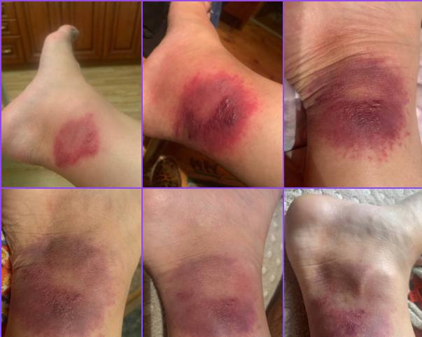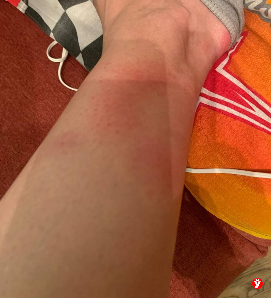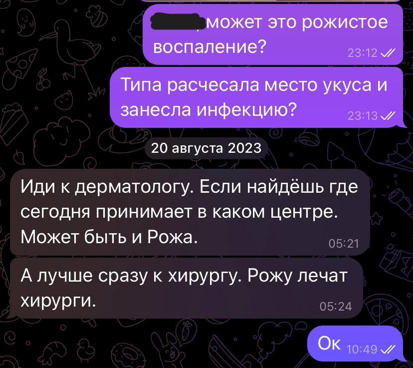 Но на следующий день пятно стало ещё больше. Повязка отвалилась сама собой, а на ноге уже красовалось странное розовое образование, которое не только росло, но и как будто меняло цвет. Оно зудело по краю. Тогда я решила написать знакомому дерматологу. Сфотографировала ногу и отправила снимок ему в Вайбер.