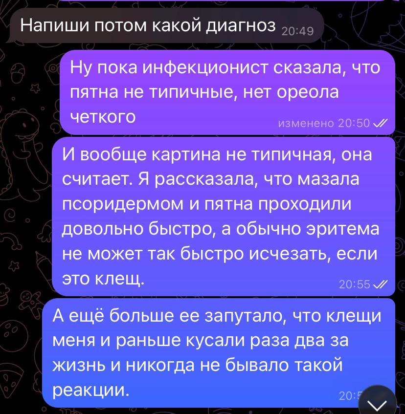 На приеме мне очень пригодились мои фотографии, сделанные до и после, поскольку пятно на ноге в этот момент было едва заметным. Оказалось, что у меня очень нетипичная картина симптомов, поэтому дерматолог и инфекционист попросили сфотографировать мою ногу и еще несколько фото прислать им для личного архива. Дело в том, что обычно пятно после клеща округлое, с ярко выраженным контуром (ареолом) и светлое внутри. А у меня темное, да еще и с мелкими пузырями, как при крапивнице. Такое редко встречается на практике.