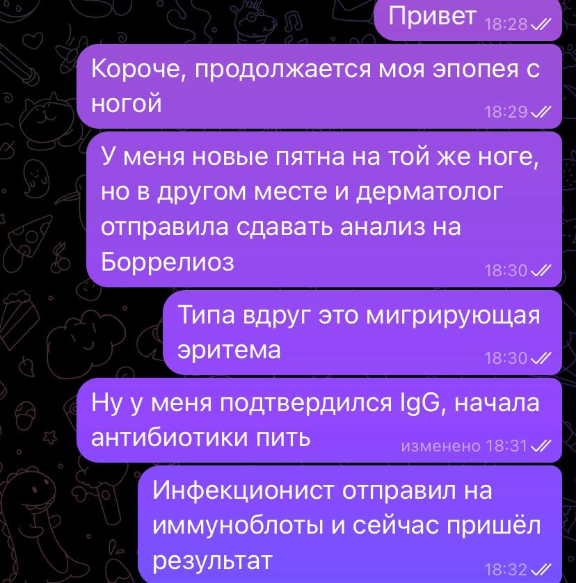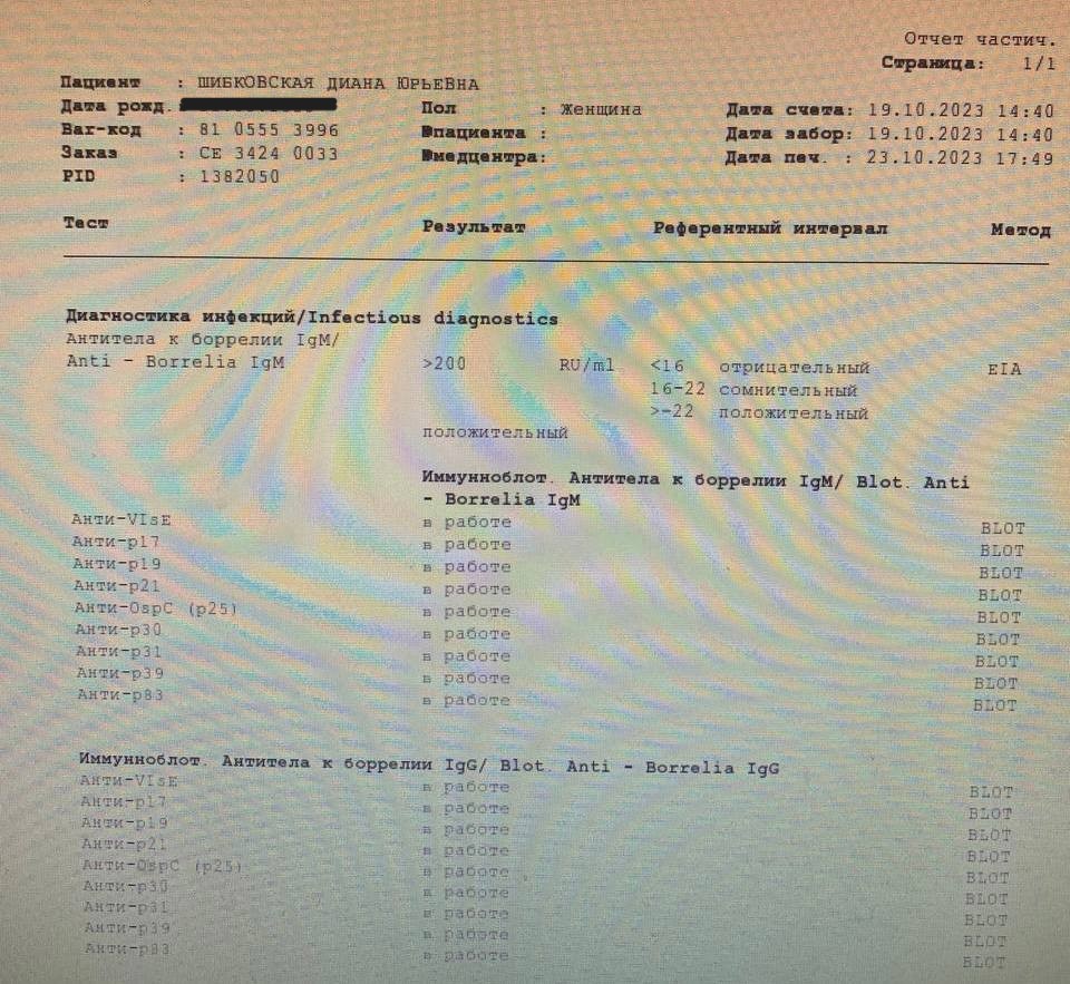 И вот еще в чем сложность: поскольку клещи раньше меня уже кусали лет 10 назад (но без такой бурной реакции организма, поэтому я не обследовалась) меня отправили на расширенный анализ, чтобы выяснить, не может ли это быть остаточным явлением. Вдруг я давно заболела, но хроническая болезнь протекала до какого-то момента бессимптомно? От этого зависел протокол лечения, то есть продолжительность антибиотикотерапии.