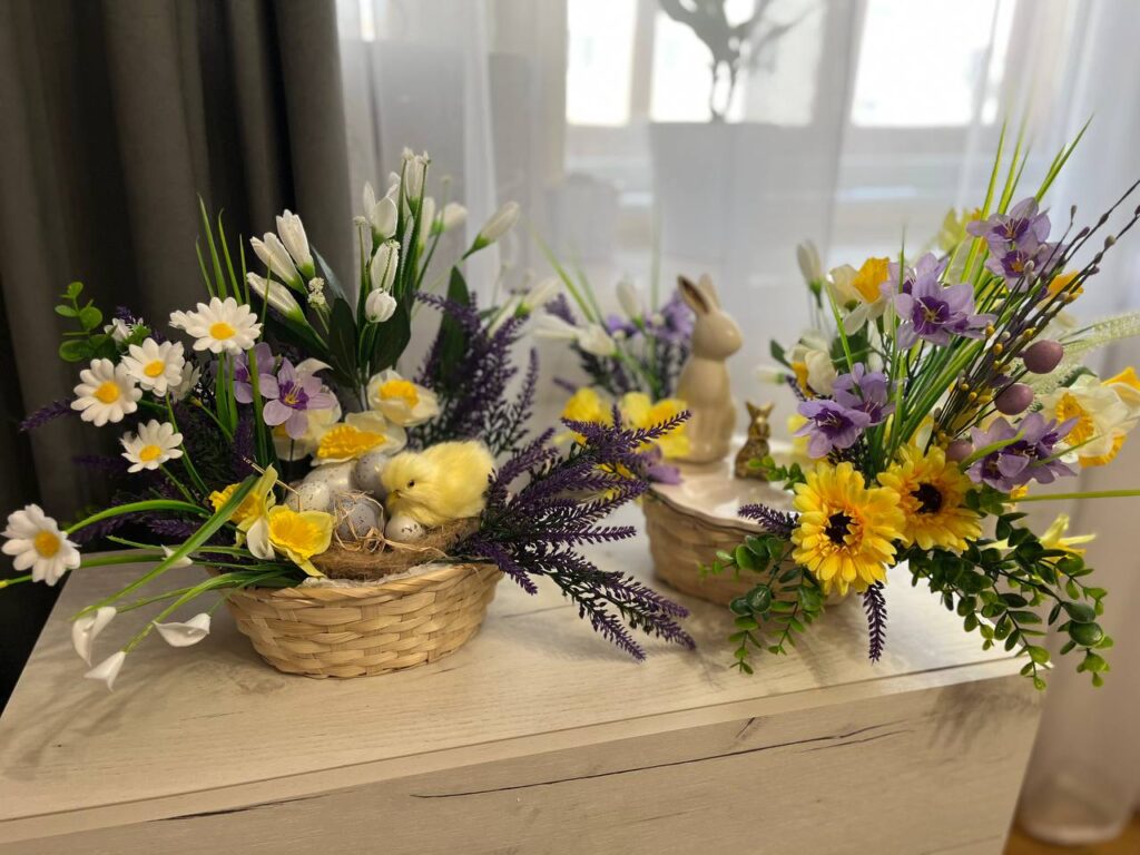 Создание композиций стало для Алины способом выразить свое отношение к празднику. Она охотно экспериментирует: объединяет декоративные цветы, фигурки животных, плетеные гнездышки, ленты и яйца. Центральное место часто занимает один из символов Пасхи — зайчик, который, по словам девушки, «оживляет» композиции.