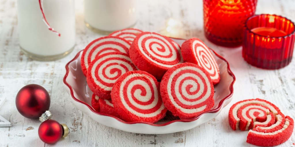 Два пласта теста, красный и белый, скручиваются в рулет, чтобы на срезе явить миру праздничный спиральный узор. Простой, но визуально эффектный рецепт.