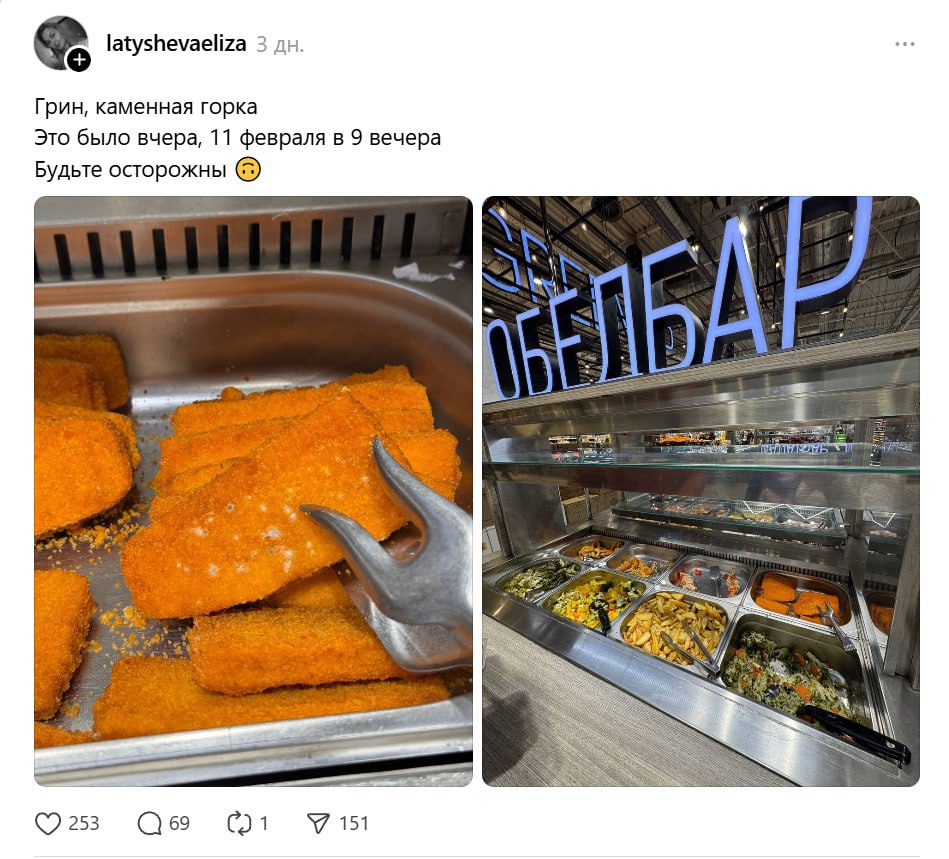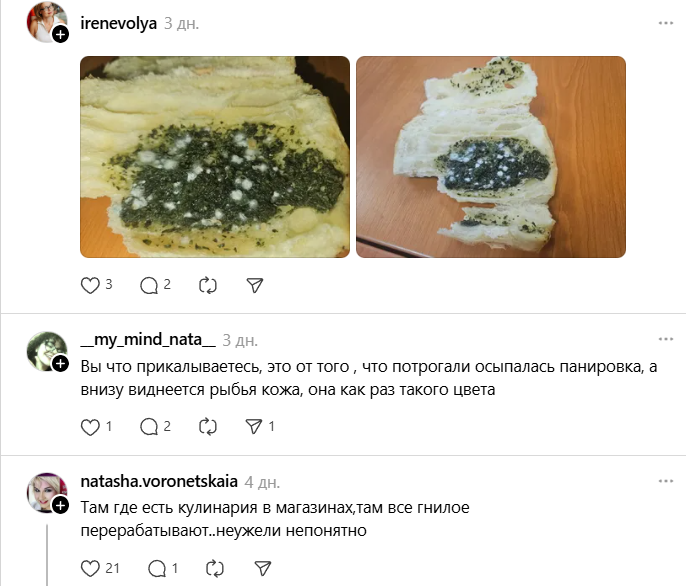 Минчанка опубликовала в соцсетях фото заплесневелой жареной рыбы в панировке из гипермаркета Green на ул. Притыцкого, 156, что спровоцировало проверку магазина. Об этом пишут «Минск-Новости».