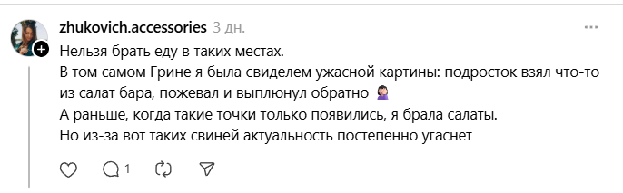 — В том самом «Грине» я была свидетелем ужасной картины: подросток взял что-то из салат-бара, пожевал и выплюнул обратно. А раньше, когда такие точки только появились, я брала салаты. Но из-за вот таких свиней актуальность постепенно угаснет.
