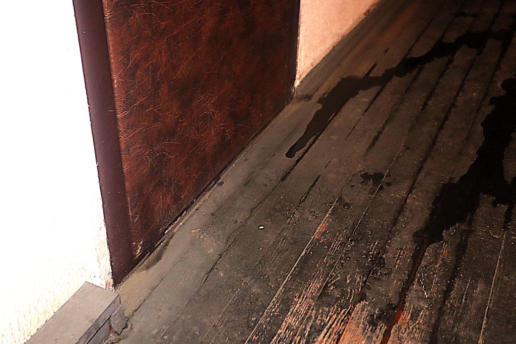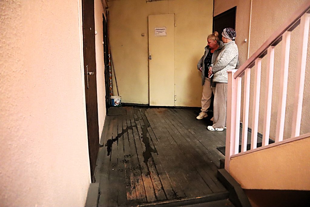 Валерий живёт в квартире №8. Он рассказал, что ведро под трубы поставили сами жильцы первого этажа. По словам мужчины, днём ранее он звонил в службу 115, а в этот день звонил в ЖРЭУ-6. Безрезультатно. Вода, если её вовремя не убирать, течёт ему под дверь.