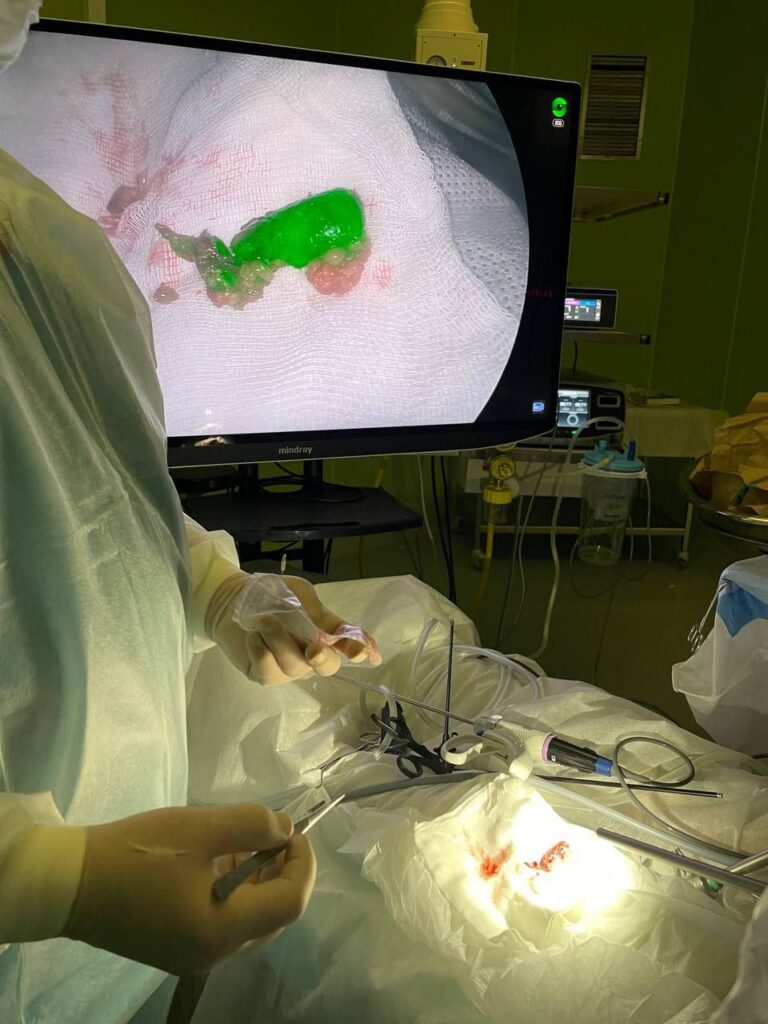 Особенностью вмешательства стало применение интраоперационной флуоресцентной навигации (ICG/NIR). С использованием препарата индоцианин зеленый хирурги смогли максимально точно определить и удалить потенциально поражённые лимфатические узлы.