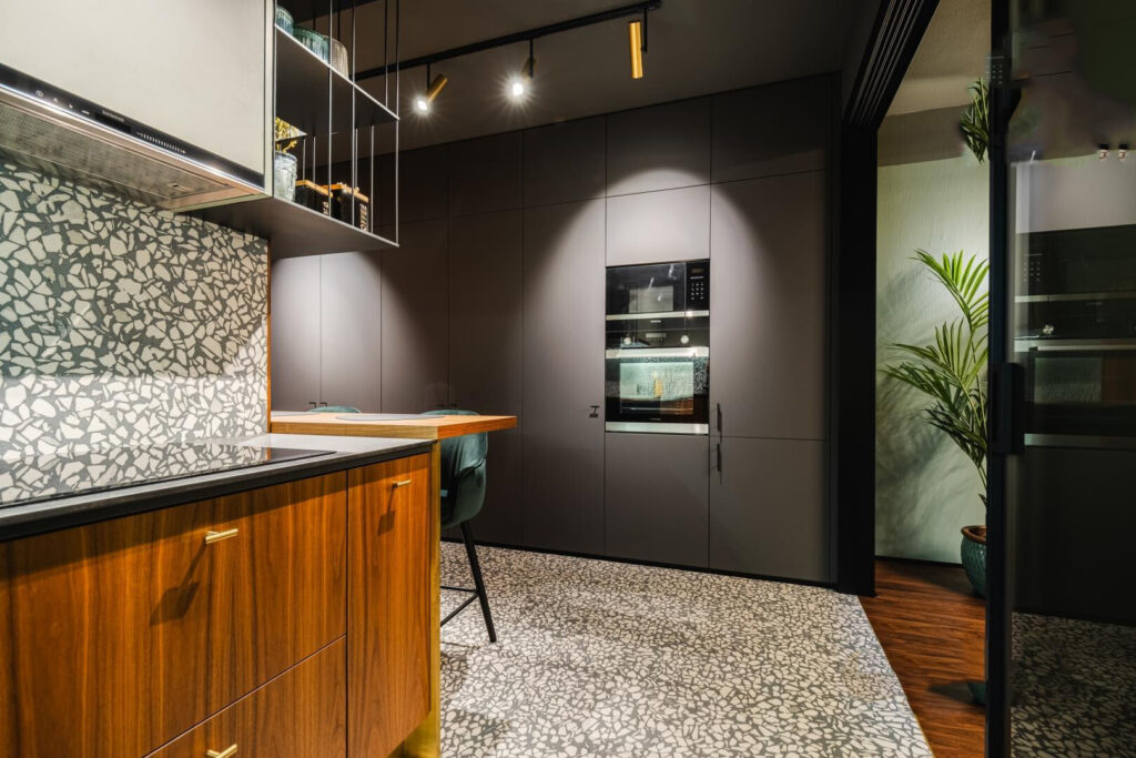 Стены квартиры облицованы натуральным шпоном. Зона готовки отделена от жилой части стильной стеклянной перегородкой. Жилая комната, напоминающая уютную гостиную, обставлена мебелью от европейских производителей. Один из стеллажей в мгновение ока трансформируется в кровать.