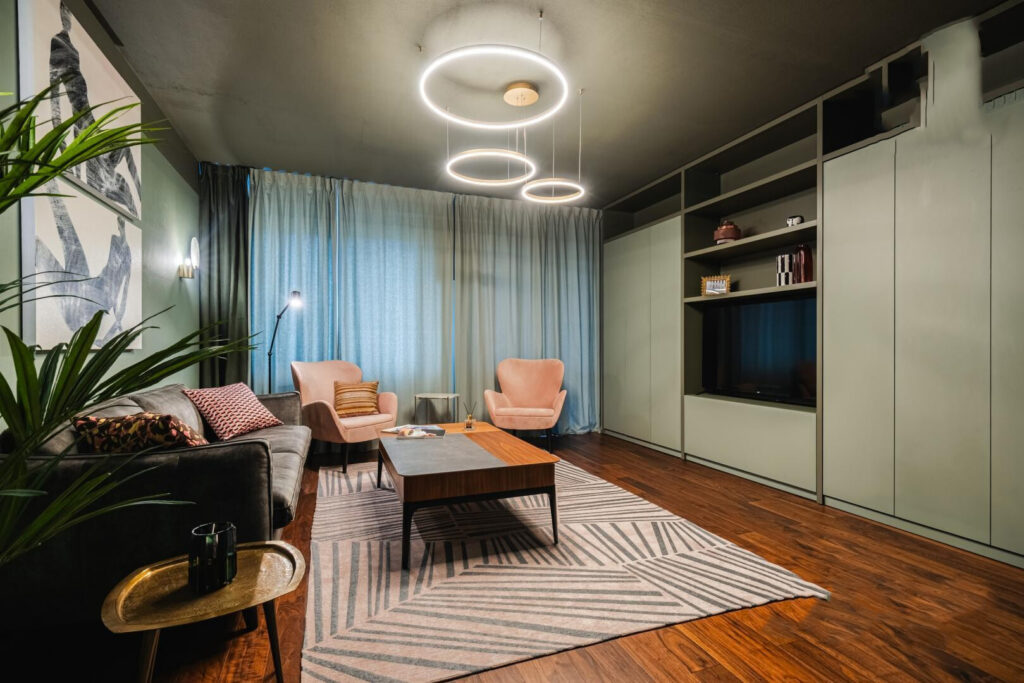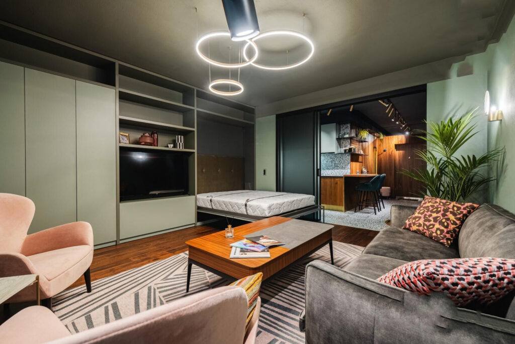 Площадь данной студии составляет 45,7 квадратных метров, что позволяет комфортно разместить все необходимые элементы для жизни.