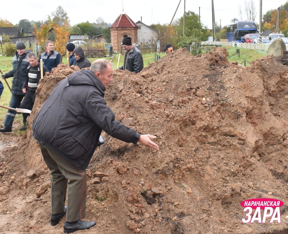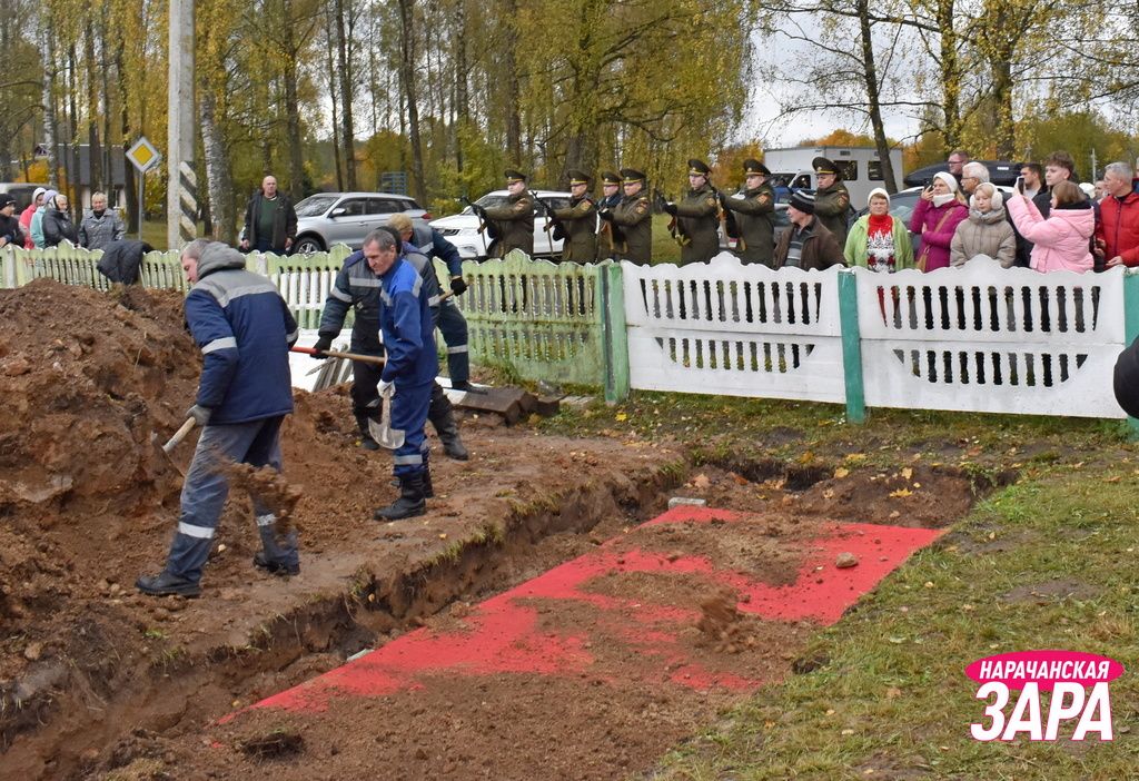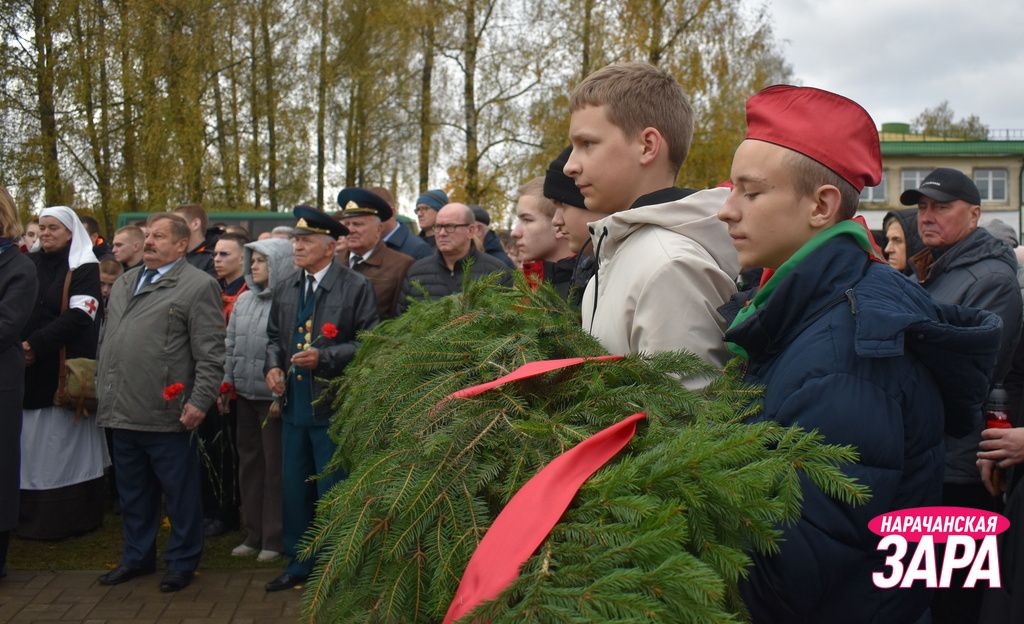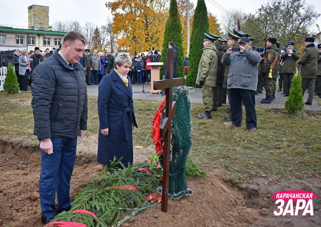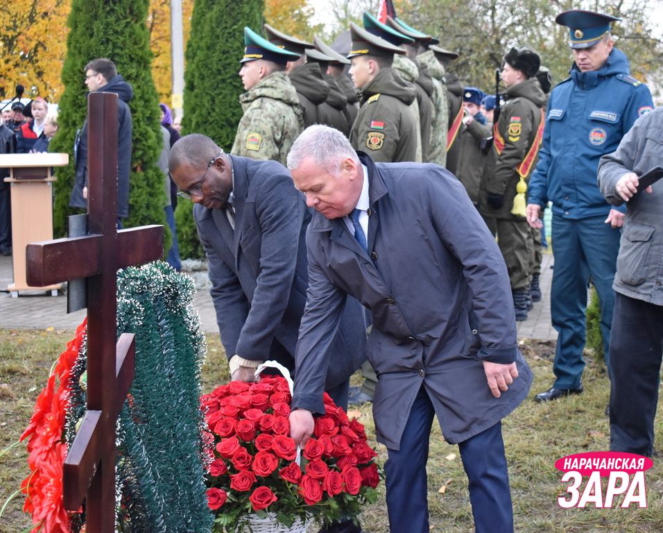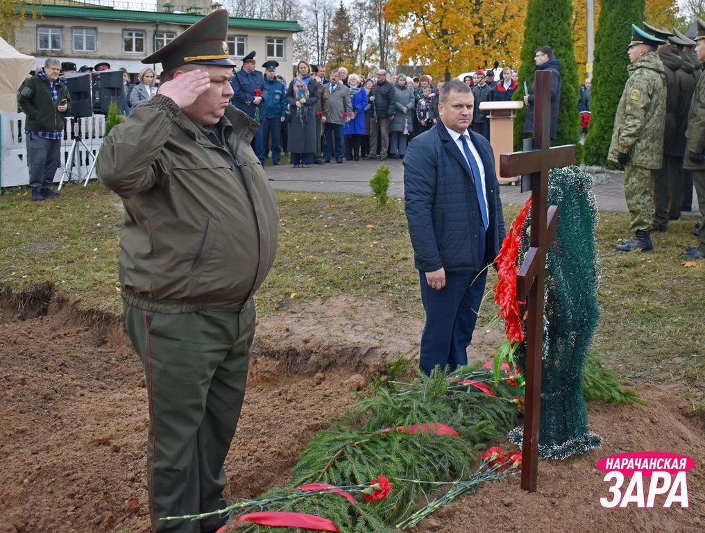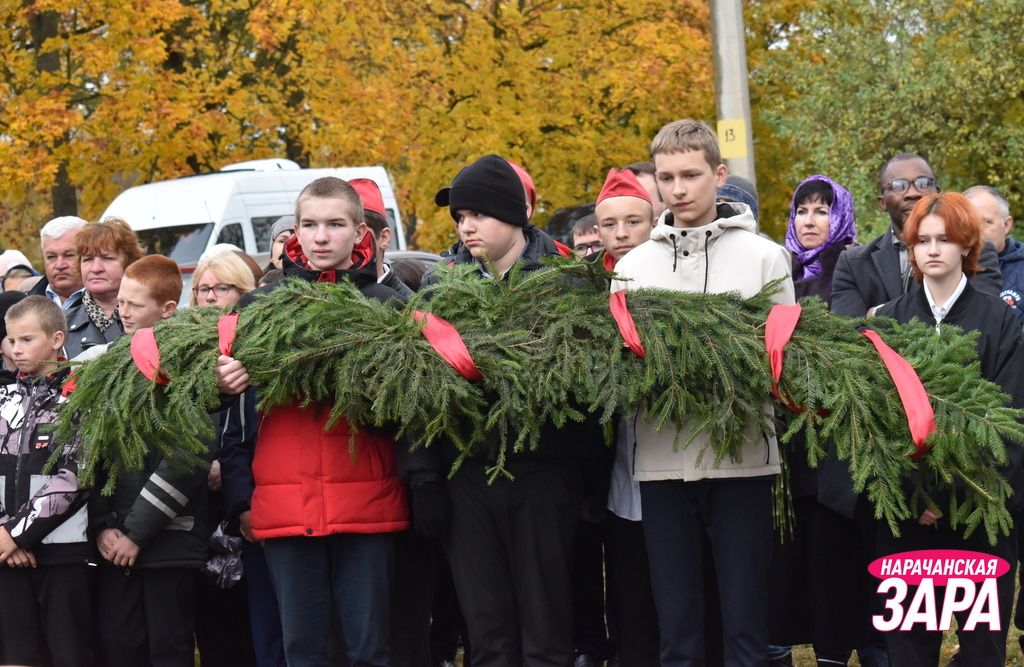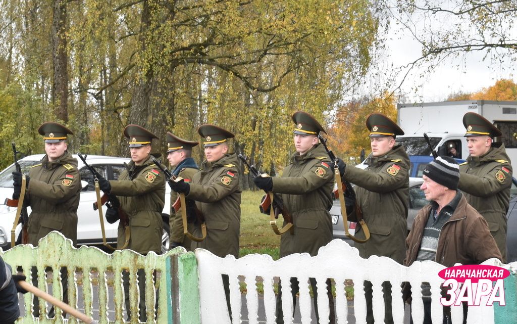 Памятный знак освятил иерей храма Преображения Господня в Занарочи Анатолий Митько. К знаку присутствующие возложили гирлянду и цветы. Память погибших воинов почтили минутой молчания.