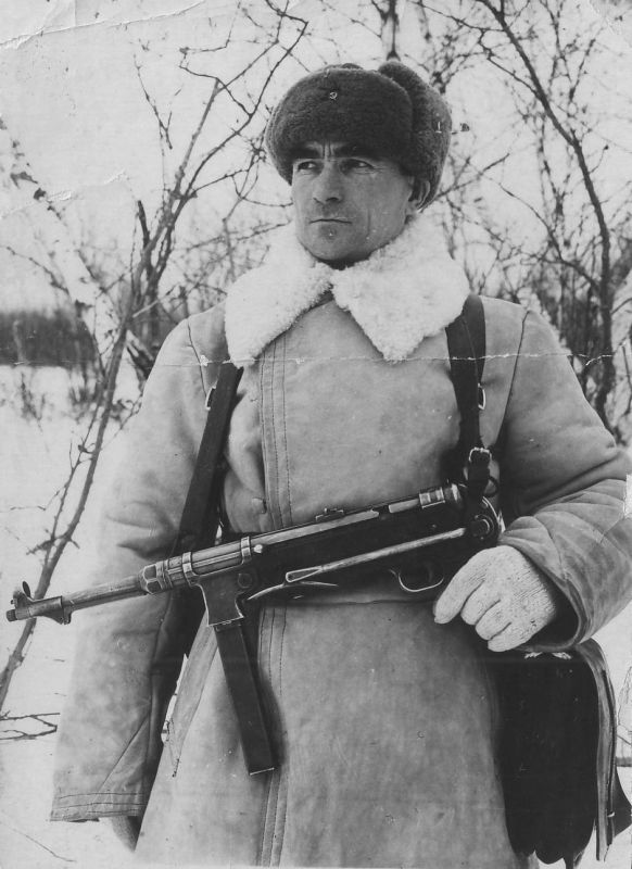 На фронтовом фото командир Красной Армии, вооруженный трофейным немецким пистолетом-пулеметом. На обороте фотографии надпись: «На добрую память дорогой Мили и моему герою Вове. В память моих боевых дней 2-й Отечественной войны. Ваш друг жизни. Афанасий Лапшов».