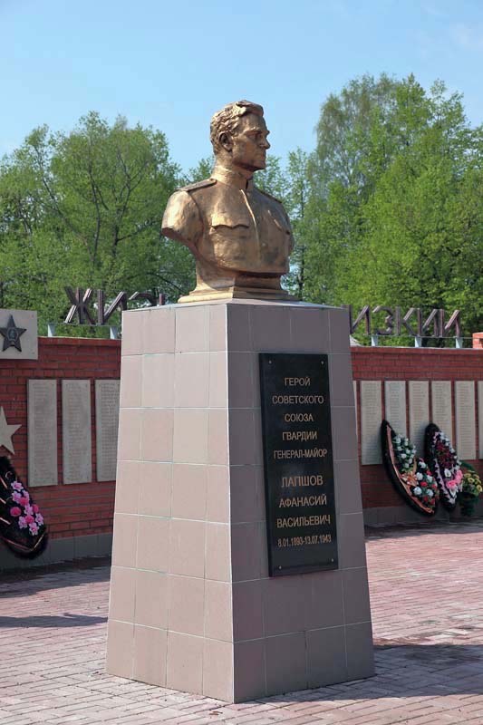В этом селе Калужской области и стоит бронзовый бюст Афанасия Лапшова, надпись под ним гласит: «Вечная память героически погибшему в боях за Родину гвардии генерал-майору, Герою Советского Союза Лапшову Афанасию Васильевичу».