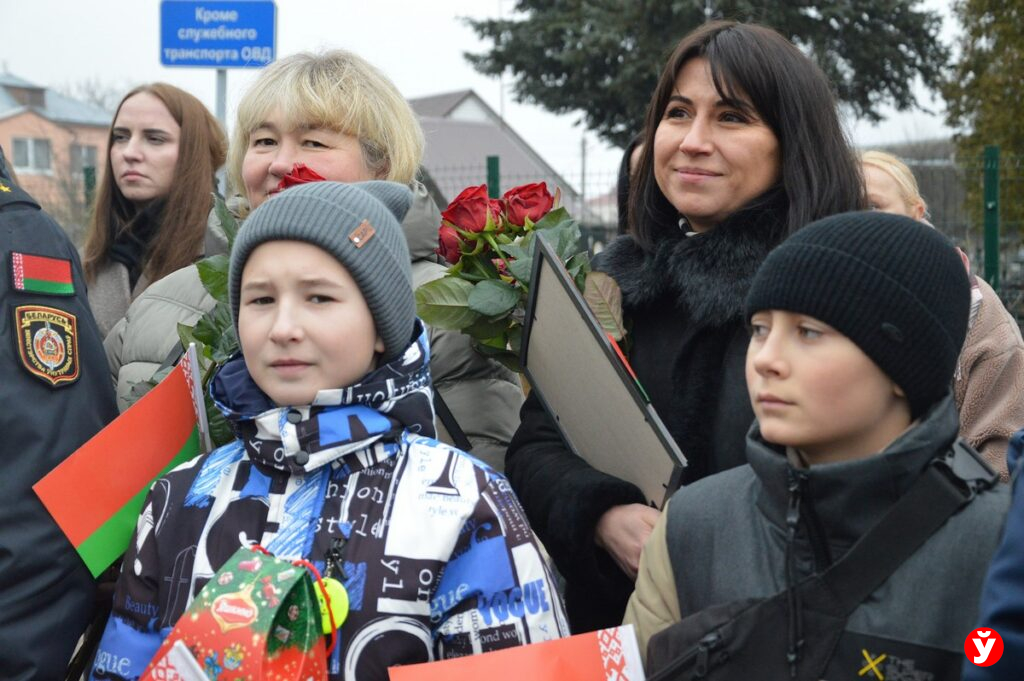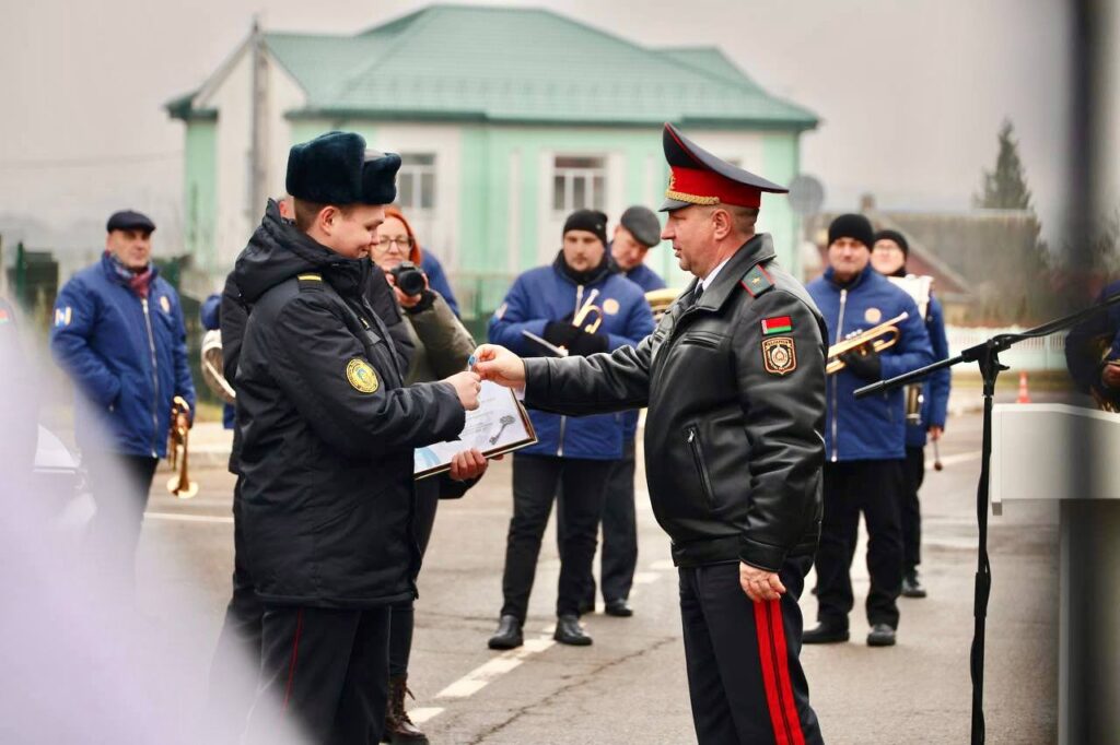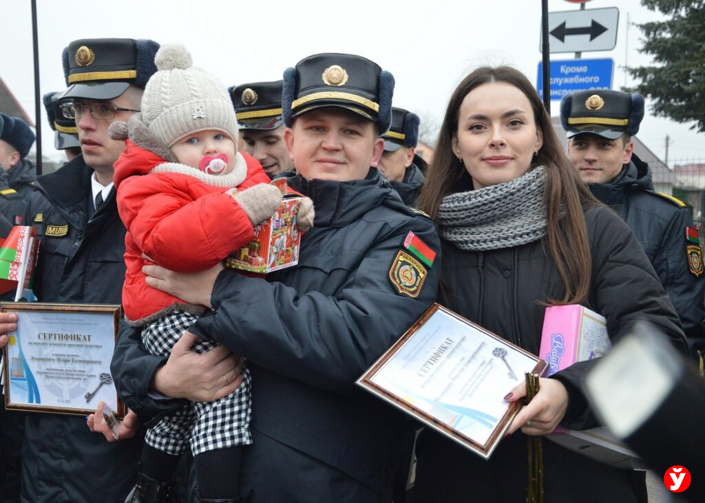 В честь праздника Александр Шепелев вручил двадцати сотрудникам территориальных подразделений Департамента охраны МВД в Минской области ключи от арендных квартир. Многие из них молодые семьи.