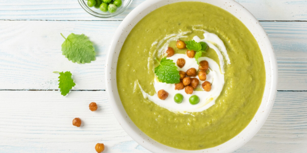 Нежность сливочно-горохового супа-пюре хорошо сочетается с подчеркнуто хрустящими нотками запеченного нута. Блюдо получается одновременно сытным и легким.